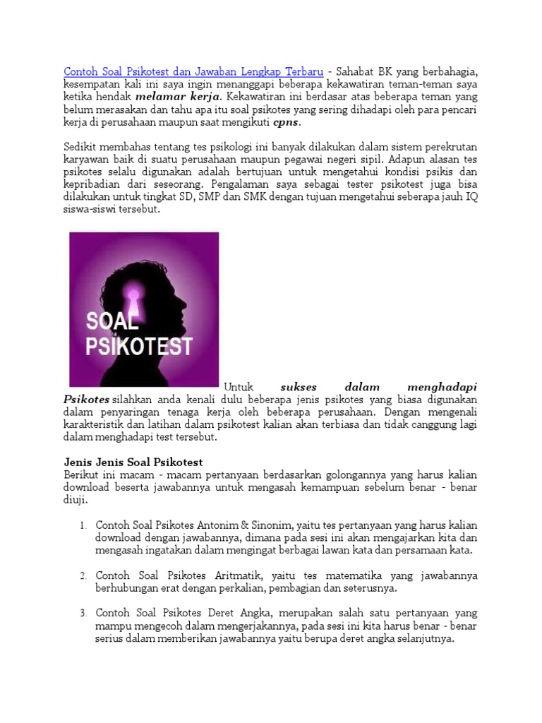 Secara garis besar psikotest dibedakan menurut jenis test kepribadian yaitu : Soal psikotest dalam ujian psikotest dipakai untuk menelusuri bakat, kecerdasan, kepribadian, tingkat emosional, penempatan karyawan, keperluan promosi serta mengenali kekuatan dan. Dapatkan contoh soal psikotest lengkap kumpulan soal soal psikotes yang bisa membantu untuk persiapan test masuk kerja ataupun test masuk sekolah dan kuliah contoh. Dari beberapa soal yang diberikan pada saat ujian psikotest tersebut, bisa dilihat kepribadian seorang calon tenaga kerja dari cara dia menjawab pertanyaan maupun jawabannya. Test kepribadian grafis adalah sebuah test yang menilai kepribadian seseorang berdasarkan gambar yang dibuatnya.